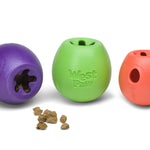 Super bouncy and crazy fun, West Paw’s treat-dispensing, puzzle dog toy, Rumbl, encourages healthy play. Rumbl's unique “fish trap” opening makes for easy loading yet keeps food inside. Doubles as a slow feeder: large fits two cups of kibble, small fits one cup. Superior durability and hollow construction make this puzzle toy’s springy material heaven to a dog’s chompers while its playful wobble adds to the excitement and increases engagement.